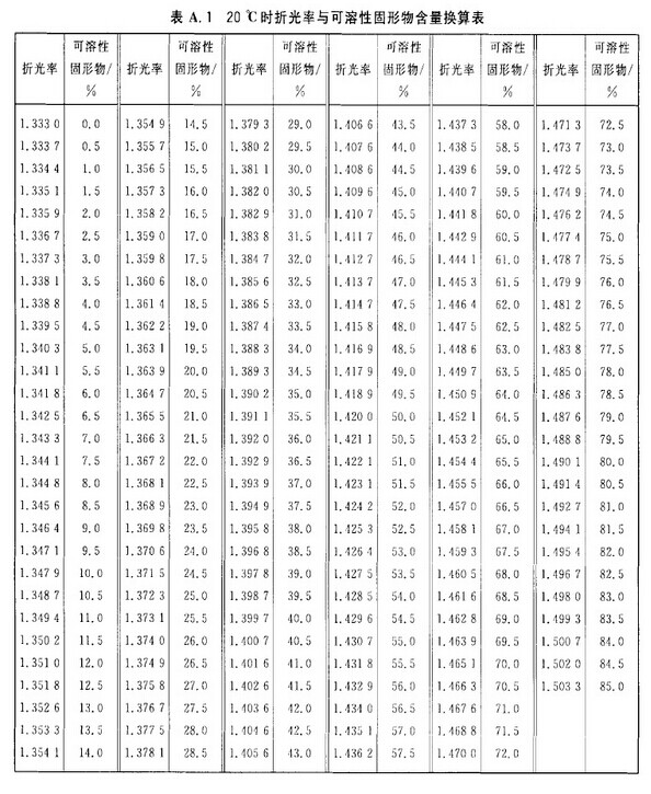 20ºC時(shí)折光率與可溶性固形物含量換算表