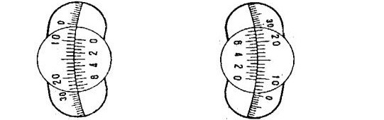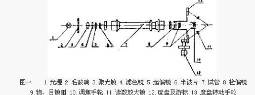 當(dāng)放進(jìn)存有被測溶液的試管后,由于溶液具有旋光性,使平面偏振光旋轉(zhuǎn)了一個(gè)角度,零度視場便發(fā)生了變化(如圖二a或c)。轉(zhuǎn)動(dòng)檢偏鏡一定角度,能再次出現(xiàn)亮度一致的視場。這個(gè)轉(zhuǎn)角就是溶液的旋光度,它的數(shù)值可通過放大鏡(10)從度盤(11)上讀出。