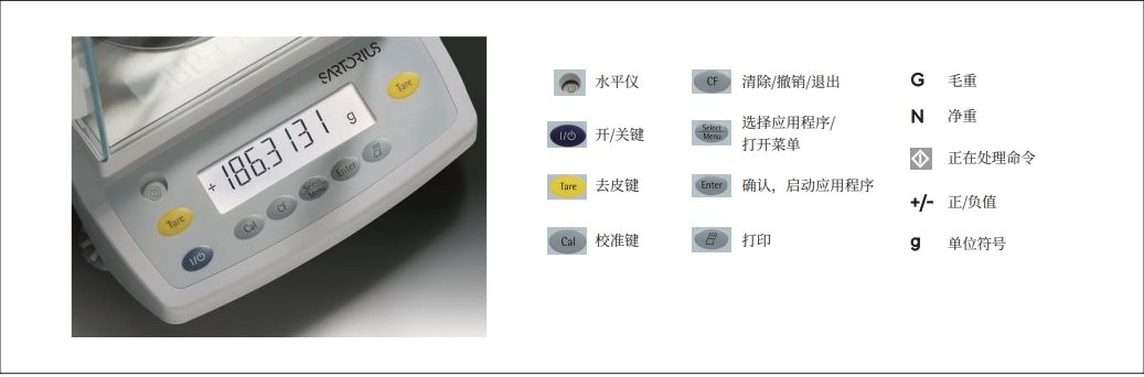 - 【注:BSA 系列天平內(nèi)置多種應用程序,如稱重、密度測定、百分比、計數(shù)、不穩(wěn)定條 件稱量(動物稱量)、凈重 - 總重、求和、系數(shù)換算、稱量單位切換等,用戶可以根據(jù) 需要在菜單中選擇所需程序,并按提示進行進一步操作!