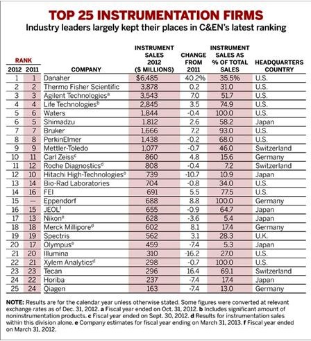 2013年4月29日,最新一期C&EN雜志的封面文章揭曉了2012年全球儀器公司排名前25的名單。C&EN自2010年開始發(fā)布全球儀器公司排名,今年是第四次發(fā)布。在今年揭曉的2012年全球儀器公司排名前25名單中,排名前十情況與2011年變化不大,排名第一為丹納赫(Danaher),排名第二為賽默飛世爾科技(Thermo Fisher Scientific),排名第三為安捷倫(Agilent Technologies)。其中,排名發(fā)生變化的是:島津(Shimadzu)降至第六位;沃特世(Waters)升至第五位;日立高新(Hitachi High-Technologies)跌出了前十,卡爾蔡司(Carl Zeiss)升至第十。詳細(xì)名單見下: