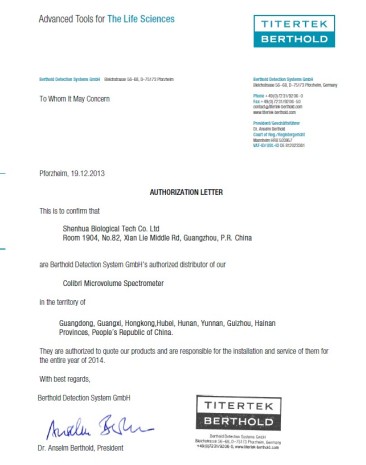 德國伯赫Titertek Berthold是一家擁有35年歷史的著名生命科學(xué)儀器制造廠商,是專注于樣品處理、自動(dòng)工作站和樣品檢測的高科技公司?偛亢脱邪l(fā)生產(chǎn)基地設(shè)在美國Huntsville和德國Pforzheim。2011年德國伯赫Titertek-Berthold公司并推出一款新型超微量分光光度計(jì)-Colibri,2013年廣州市深華生物技術(shù)有限公司正式成為德國Norllu伯赫公司超微量分光光度計(jì)南方區(qū)總代理。