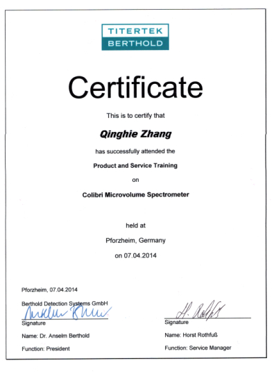 在4月份廣州市深華生物技術(shù)有限公司在總經(jīng)理張清杰的帶領(lǐng)下一行三人參加了第24屆Analytica 2014德國(guó)慕尼黑實(shí)驗(yàn)室分析生化儀器展。在德國(guó)伯赫公司的工廠(chǎng)接受了產(chǎn)品培訓(xùn),(Titertek Berthold是一家擁有35年歷史的著名生命科學(xué)儀器制造廠(chǎng)商,是專(zhuān)注于樣品處理、自動(dòng)工作站和樣品檢測(cè)的高科技公司,總部和研發(fā)生產(chǎn)基地設(shè)在美國(guó)Huntsville和德國(guó)Pforzheim),廣州深華公司也成功獲得德國(guó)伯赫Titertek Berthold產(chǎn)品售后培訓(xùn)資格證書(shū)。