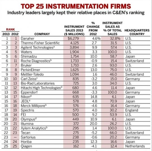 在今年揭曉的2013年全球儀器公司排名前25名單中,排名前十情況與2012年變化不大,排名第一依然為丹納赫(Danaher),排名第二為賽默飛世爾科技(Thermo Fisher Scientific,Life Technologies的2013年收入未記在內(nèi)),排名第三為安捷倫(Agilent Technologies)。其中,排名發(fā)生最大變化的是羅氏診斷(Roch Diagnostics),它從2012年排名第11上升至排名第6;并且由于Life Technologies被賽默飛世爾收購,Life Technologies從排行榜中消失。此外,賽多利斯(Sartorius)首次進(jìn)榜,排名第23位。詳細(xì)名單名單見下: