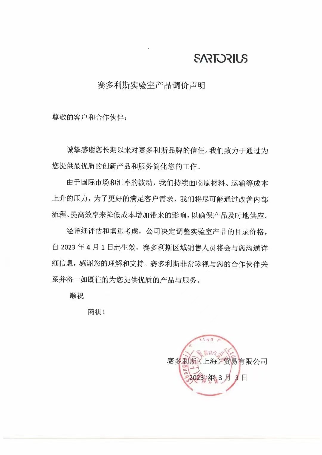 誠摯感謝您長期以來對賽多利斯品牌的信任。我們致力于通過為您提供最優(yōu)質的創(chuàng)新產品和服務簡化您的工作。由于國際市場和匯率的波動,我們持續(xù)面臨原材料、運輸等成本上升的壓力,為了更好的滿足客戶需求,我們將盡可能通過改善內部流程、提高效率來降低成本增加帶來的影響,以確保產品及時地供應經詳細評估和慎重考慮,公司決定調整實驗室產品的目錄價格自2023年4月1日起生效,賽多利斯區(qū)域銷售人員將會與您溝通詳細信息,感謝您的理解和支持。賽多利斯非常珍視與您的合作伙伴關系并將一如既往的為您提供優(yōu)質的產品與服務。順祝商祺!